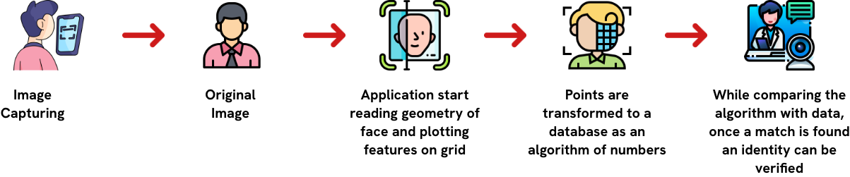 - The Initial step is face detection, the second is normalization, the third is feature extraction, and the final step is face recognition.